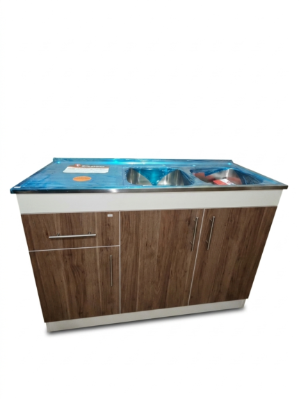 ¡Dale un nuevo aire a tu cocina! ✨ Te presentamos este moderno mueble lavaplatos de 1.20m. Combina la resistencia de una cubierta de acero inoxidable con el estilo cálido de un mueble acabado en madera oscura. Su diseño de 3 puertas y 1 cajón es perfecto para organizar todos tus artículos de limpieza. 🧽🧼